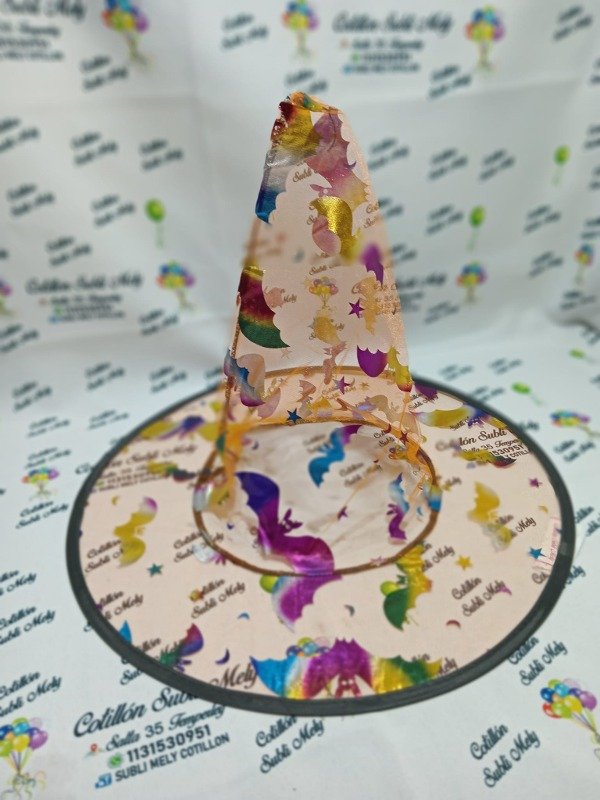 GORRO DE BRUJA DE TULL NARANJA Y BORDES NEGROS Y MURCIELAGOS