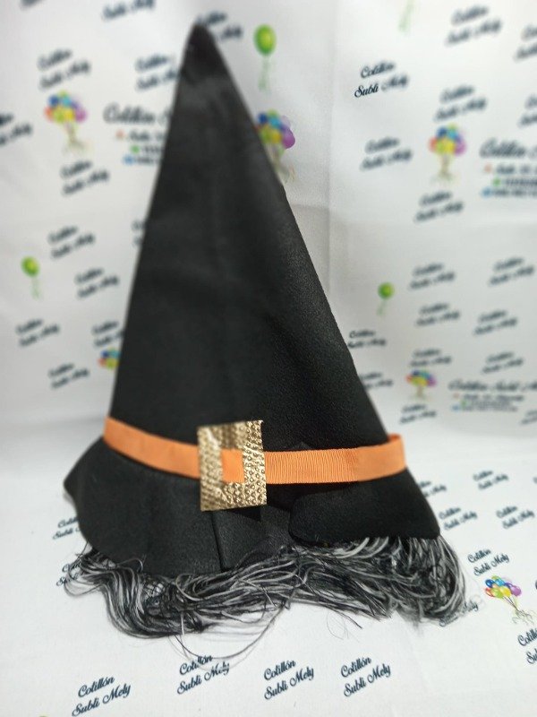 SOMBRERO DE BRUJA NEGRO CON CINTA NARANJA Y EBILLA